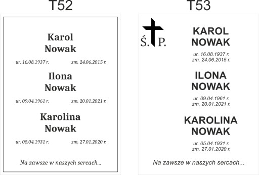 - Ewentualne zmiany w podanym wzorze (czcionka, grafika, cytat, epitafium)