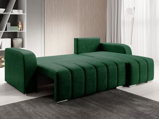 Narożnik Pufetto to model o nowoczesnej bryle, która doskonale prezentuje się w nowoczesnych wnętrzach. Do jego wykonania została wykorzystana przyjemna w dotyku oraz wytrzymała tkanina. Dostępne kolory doskonale komponują się z minimalistycznymi przeszyciami, które zostały zastosowane na siedzisku. Natomiast oparcie narożnika stanowią gładkie, duże poduszki, które zostały wyposażone w zamek błyskawiczny. Warto również podkreślić, że narożnikposiada funkcję spania. Po rozłożeniu jego wymiary to 203 cm x 130 cm, co gwarantuje komfortowy sen dla jednej lub dla dwóch osób. Dodatkowo w skrzyni mebla mieści się pojemnik na pościel.