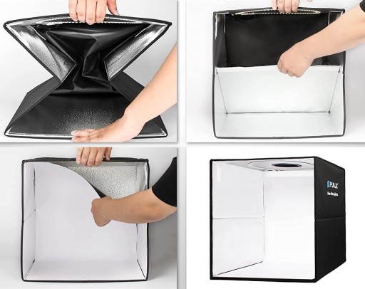 To tylko 4 kroki, bez skomplikowanego procesu instalacji. 5 krok - to już fotografowanie. Mocowanie studio jest za pomocą trwałym i szybkich rzepów. Namiot studyjny może nie tylko zapewnić jednolite oświetlenie, ale także wyeliminować cienie i odbicia. Co ważniejsze, nie ma efektu stroboskopu. Nie męczy wzroku przy dłuższej pracy. Bez ciężkiej metalowej ramy nośnej jest znacznie lżejszy i łatwiejszy do przenoszenia.