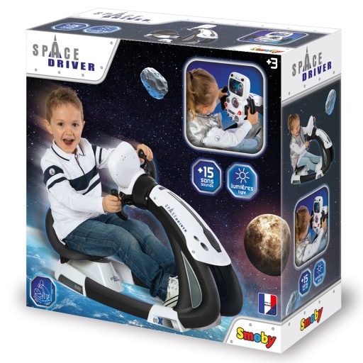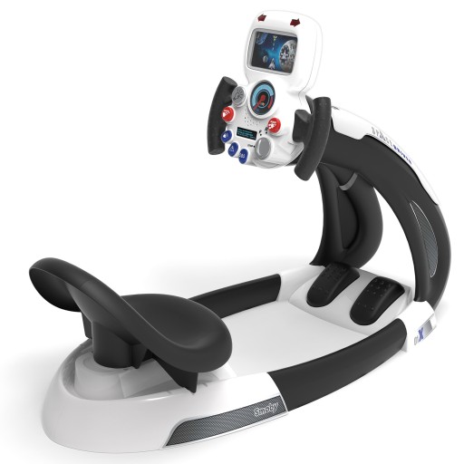 Kosmiczny symulator jazdy to zabawka idealna dla miłośników podróżowania w kosmosie. Dziecko może usiąść wygodnie za kierownicą, położyć nogi na pedałach i wystartować statkiem kosmicznym w podróż.