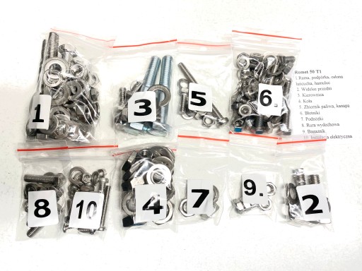 Komplet złożony jest z chromoniklowych elementów nierdzewnych wykonanych w klasie A2. W skład kompletu wchodzą śruby, wkręty, nakrętki i podkładki podzielone na 10 osobno spakowanych grup, umożliwiających bezproblemowy montaż poszczególnych elementów motocykla.
