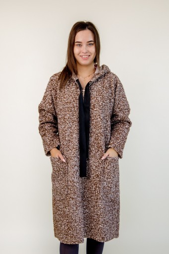 Ciekawy melanżowy materiał o lekko wypukłej fakturze nadaje produktowi oryginalności, natomiast kaptur oraz ozdobna taśma dodają mu lekko sportowego charakteru. Naszywane kieszonki pozwolą zabrać najpotrzebniejsze akcesoria. Płaszczyk będzie idealnym wyborem na co dzień, na spacer czy do pracy.