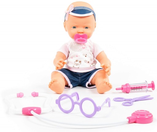Lalka posiada smoczek oraz śliczne ubranka. Lalka wygląda bardzo realistycznie. Wszystkie elementy są szczegółowo wykonane. W zestawie są akcesoria, które umożliwią dodatkowo zabawę w lekarza, m.in. słuchawki, strzykawkę, nożyczki, okulary. Całość zapakowana w eleganckie pudełko.