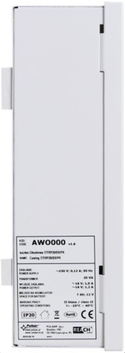 AWO000 Posiada wbudowany transformator TRP 20 VA / 16 V / 18 V, miejsce na akumulator ołowiowo - kwasowy 7 Ah / 12 V i zabezpieczenie antysabotażowe, chroniące przed nieautoryzowanym otwarciem obudowy (styki typu NC). AWO000 posiada 8 mm dystans od ściany, dzięki któremu możliwe jest łatwe doprowadzenie przewodów do zamontowanych w niej urządzeń.