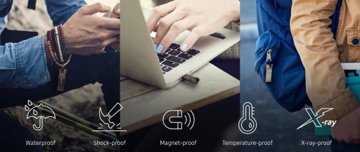 Niezależnie od tego, gdzie jesteś, pliki pozostają bezpieczne. Ekspertyza Samsung w zakresie pamięci USB czyni z Bar Plus pendrive, na którym bez żadnych obaw możesz przechowywać cenne dane. Doskonałą ochronę stanowi obudowa odporna na wodę*, wstrząsy**, temperaturę***, magnes**** oraz promienie rentgena*****.