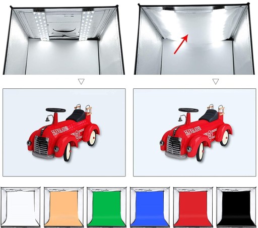 To tylko pięć kroków, bez skomplikowanego procesu instalacji. Szósty krok - to już fotografowanie. Mocowanie studio jest za pomocą trwałym i szybkich rzepów. Namiot studyjny może nie tylko zapewnić jednolite oświetlenie, ale także wyeliminować cienie i odbicia. Co ważniejsze, nie ma efektu stroboskopu. Nie męczy wzroku przy dłuższej pracy. Bez ciężkiej metalowej ramy nośnej jest znacznie lżejszy i łatwiejszy do przenoszenia.