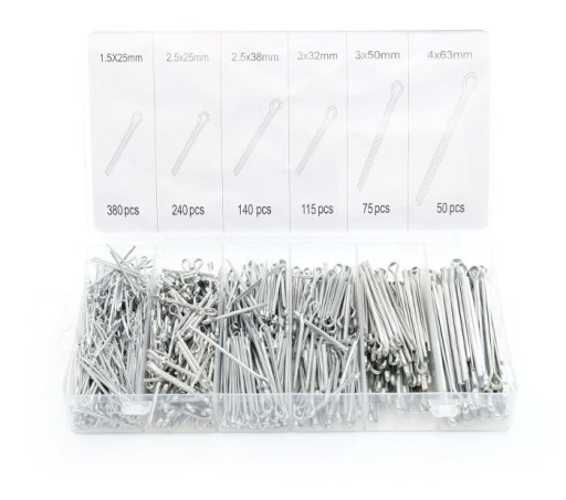 Całość zapakowana jest w plastikowym pojemniku, w którym każdy rodzaj zawleczki ma swoje oznaczone miejsce.