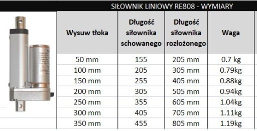 - Prędkość wysuwu (100% obciążony): 9 mm/s