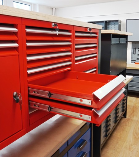 • kolor; korpus antracyt (kolor firmowy), fronty: czerwony-RAL 3020, uchwyty w kolorze aluminium –RAL 9006