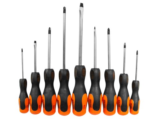 Zestaw zawiera 9 sztuk wkrętaków płaskich oraz krzyżakowych umieszczonych w plastikowej zawieszce.