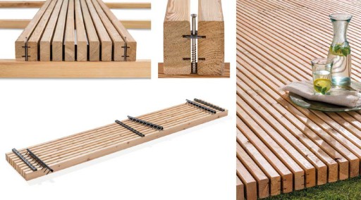 Wysokość całego modułu wynosi 70 mm, natomiast sama deska wykonana z modrzewia syberyjskiego ma wysokość 55 mm i w razie konieczności można ją wielokrotnie szlifować, w celu odzyskania efektu nowości. Zalety systemu PINUTEX można wykorzystać również do zabudowy siedzisk na ławkach ogrodowych lub do konstruowania różnego rodzaju podestów lub kładek.