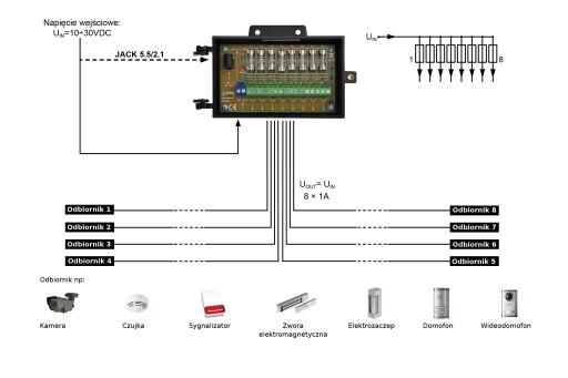 - Wyjście zasilania 8 x 1A / Uaux = Uin