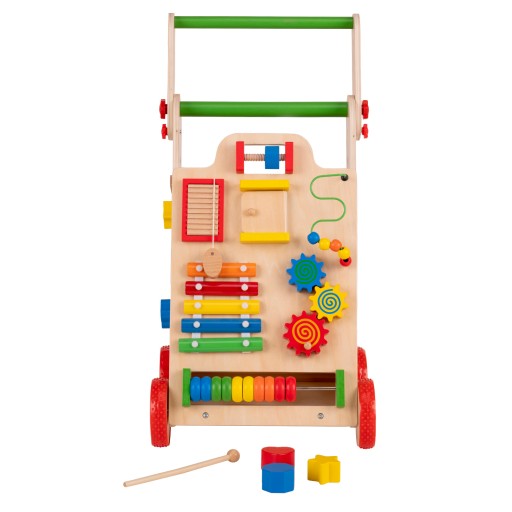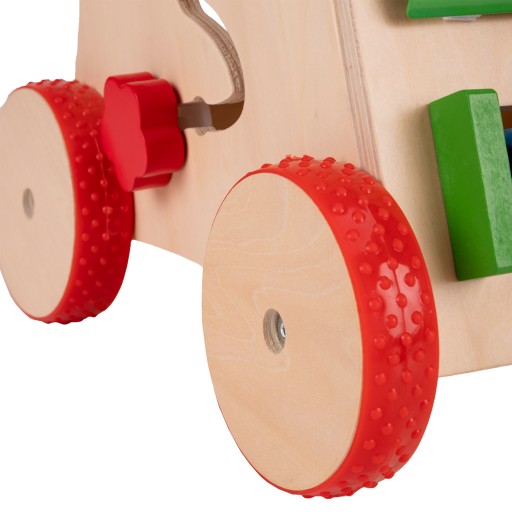 Dodatkowo, chodzik posiada kieszeń na zabawki, która zapobiega ich wypadnięciu, oraz antypoślizgowe koła. Zabawka wykonana jest z wysokiej jakości certyfikowanego drewna, pokryta nietoksyczną farbą, co zapewnia bezpieczeństwo dla dziecka.