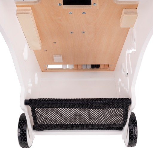 Dodatkowo, chodzik posiada kieszeń na zabawki, która zapobiega ich wypadnięciu, oraz antypoślizgowe koła. Zabawka wykonana jest z wysokiej jakości certyfikowanego drewna, pokryta nietoksyczną farbą, co zapewnia bezpieczeństwo dla dziecka.