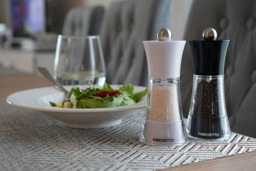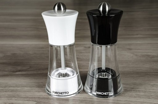 Zestaw pięknie wpasuje się do wnętrz klasycznych jak i nowoczesnych. Klasyczne czarno – białe barwy ułatwiają operowanie młynkiem - domyślnie czarny do pieprzu, biały do soli.