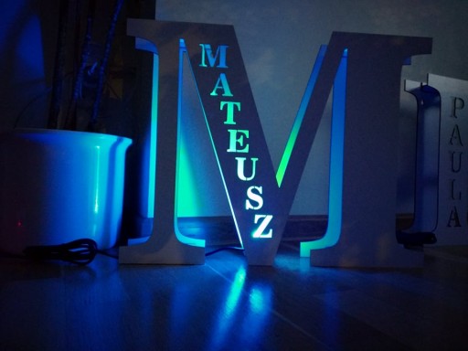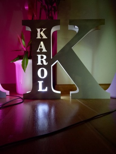 Przedmiotem sprzedaży jest lampka literka i imieniem, lampka wykonana jest w nowoczesnym stylu z białego materiału HDF dzięki czemu wpasuje się w każdy wystrój pokoju. Lampka może stać na meblach lub można ją powiesić na ścianie dzięki specjalnym otworom. Literka posiada wbudowany moduł LED RGB, w zestawie otrzymują państwo pilot do kontroli kolorów, dzięki pilotowi można również włączać i wyłączać lampkę oraz ściemniać i rozjaśniać światło jak i zmieniać różne tryby świecenia. Lampki mają 39 cm wysokości a szerokość zależy od literki i wynosi między 18 a 40 cm. Do wyboru mamy dwie opcje zasilania, kabel USB 1,8 metra lub zasilanie na baterie 3xR6 (w zestawie nie ma źródła zasilania) po zakupie proszę podać imię i literkę jeśli miałaby być inna od imienia. Poniżej kilka zrealizowanych projektów.