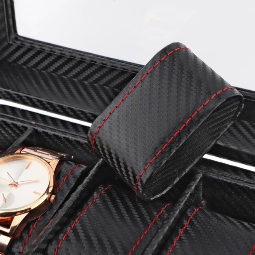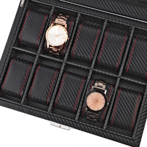 Szkatułka idealnie nada się na prezent, zarówno dla mężczyzn, jak i dla kobiet. Twarde tworzywo skutecznie chroni znajdujące się w środku przedmioty przed zarysowaniami czy kurzem. Warstwa zewnętrzna przypomina swoją strukturą karbon - pudełko jest czarne, delikatnie błyszczące. Przeszycia czerwoną nicią dodają mu elegancji. Samo w sobie może stanowić ciekawy i atrakcyjny element wystroju domu!