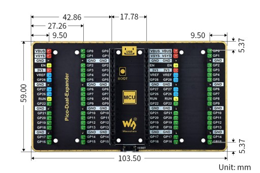 Kolejny produkt z serii rozszerzeń do Raspberry Pi Pico - ekspander wyprowadzeń Pico Dual Expander wyprodukowany przez Waveshare. Umożliwia rozszerzenie funkcjonalności Raspberry Pi Pico. Posiada dwa pola (z pinami męskimi) w układzie 2 x 20 pin przeznaczone na dodatkowe urządzenia peryferyjne oraz jedno pole (z pinami żeńskimi) na moduł główny - Raspberry Pi Pico. Każde z wyprowadzeń zostało odpowiednio opisane, aby użytkownik wiedział, czemu odpowiada poszczególny pin. Znacznie usprawnia to proces podłączania i redukuje możliwość występowania pomyłek. Ekspander nie wymaga dodatkowego lutowania. Wymiary zewnętrzne płyty wynoszą 103,5 x 55 mm