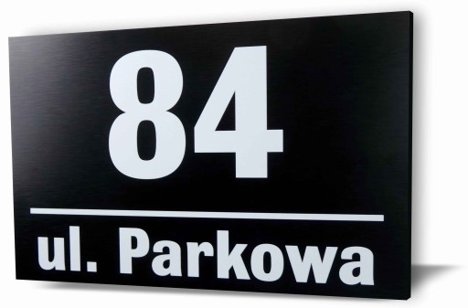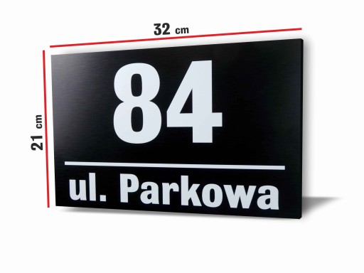 TABLICZKA ADRESOWA Z NUMEREM I NAZWĄ ULICY 32 x 21 cm. WYKONANA Z CZARNEGO DIBONDU SZCZOTKOWANEGO, ZADRUKOWANA METODĄ UV. BARDZO TRWAŁA I ELEGANCKA