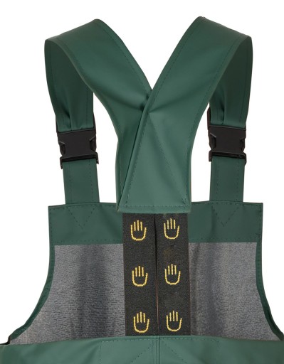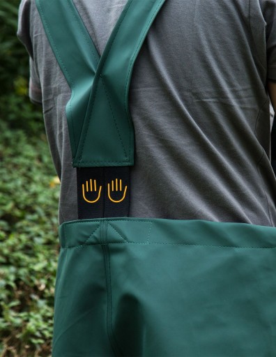 Spodnie ogrodniczki z regulowanymi szelkami z elastyczną, szeroką gumą z tyłu. Model produkowany z wodoochronnej tkaniny Plavitex® (Poliester/PVC - tkanina na podkładzie poliestrowym jednostronnie powlekana PCV polichlorkiem winylu, gramatura: 350 g/m², grubość: 0,48 mm). Plavitex® charakteryzuje się wysoką odpornością na rozdzieranie, wodoszczelnością szwów oraz wysoką odpornością na zginanie przy ujemnych temperaturach (nawet do – 50°C). Spodnie przeznaczone do użytku w niesprzyjających warunkach pogodowych. Zapewnia skuteczną ochronę przed wiatrem i deszczem. Technika obustronnego zgrzewania zwiększa wytrzymałość szwów.