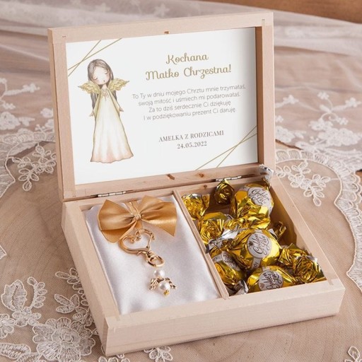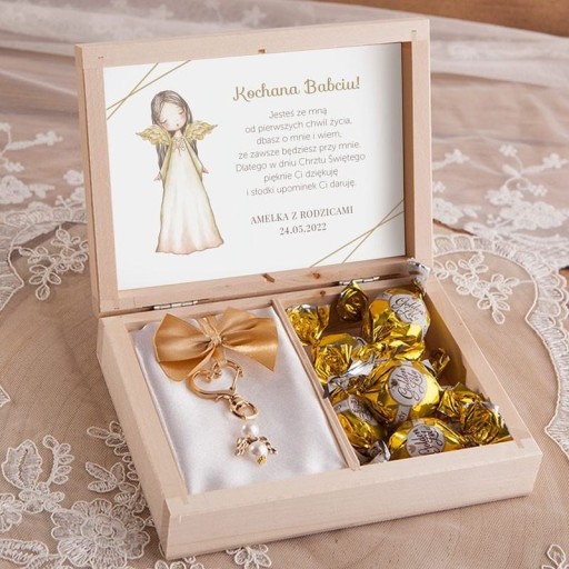 Przepiękne podziękowanie dla Chrzestnych i Dziadków przygotowane specjalnie na Chrzest Święty. Wyjątkowa propozycja, która oczaruje najbliższe osoby. Podziękowanie umieszczone jest w drewnianej skrzyneczce, w której na miękkiej gąbeczce znalazł się efektowny brelok z aniołkiem przewiązany złotą kokardą. w drugiej przegródce znalazły się czekoladowe cukierki w złotych papierkach!