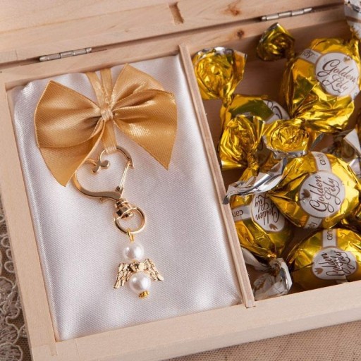 - skład: pudełko z dwiema przegródkami wykonane z jasnego drewna; w pudełku znajdują się 2 przegródki: w jednej umieszczone zostały czekoladowe cukierki w złotych papierkach, w drugiej znajduje się efektowny brelok w złotym kolorze zakończony zawieszką w kształcie aniołka i przewiązany złotą kokardką; wieczko pudełeczka jest gładkie