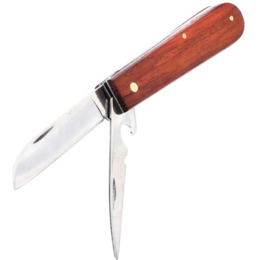 Nóż monterski, którego uchwyt został obudowany drewnianymi okładkami. Ostrza zabezpieczone blokadą, która chroni przed niekontrolowanym otwarciem.