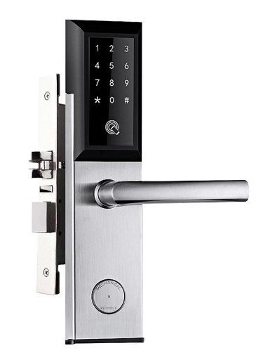 Metalowy zamek szyfrowy kodowy - klamka z zamkiem elektromechanicznym, czytnikiem kart dostępowych RFID i klawiaturą kodową dotykową