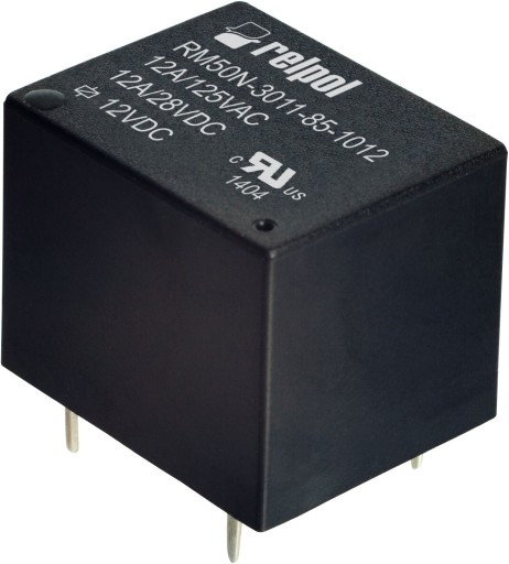 Przekaźnik elektromagnetyczny, miniaturowy, do obwodu drukowanego. Wyjście: 1P - jeden zestyk przełączny - wyprowadzenia: 11-12-14; AC1 - 12 A / 125 V; DC1 - 12 A / 28 V.