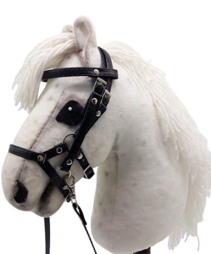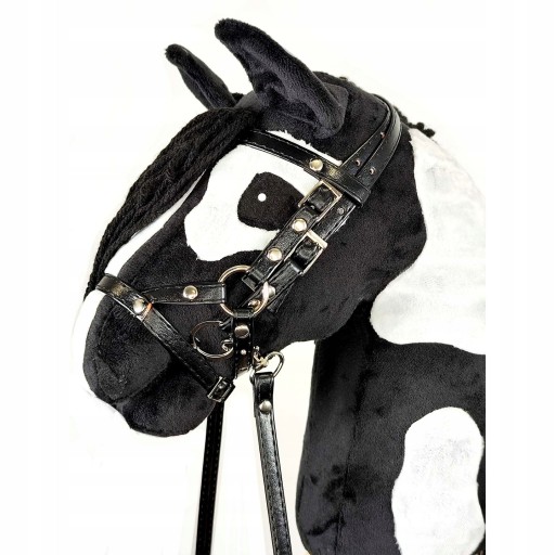 Oferujemy Państwu regulowane ogłowie anatomiczne dla hobby horsa wraz z wędzidłem, wykonane z ekoskóry oraz napowane.