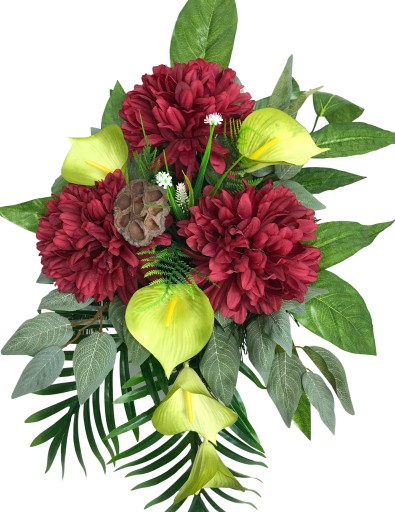 Kompozycja kwiatowa została wykonana z najwyższej jakości kwiatów sztucznych i dodatków. Do stworzenia dekoracji zostały wykorzystane piękne chryzantemy, kalie, suszone kwiaty lotosu, duża ilość zielonych liści, w tym liście palmy oraz duża ilość dodatków, wypełniająca puste przestrzenie.