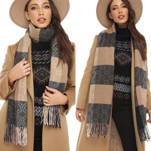 ТЕПЛЫЙ ШАРФ, клетчатая бахрома, бежевый, черный