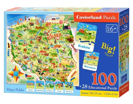 Układając Edukacyjną Mapę Polski dziecko dowie się jak wygląda Polska i z jakimi krajami graniczy. Pozna najbardziej znane obiekty lub związane z regionem wydarzenia. Na koniec utrwali swoją wiedzą rozwiązując quiz. Układanka Mapa Polski - zachęca do pogłębiania swojej wiedzy na temat naszego kraju. Stanowi doskonały materiał dydaktyczny w edukacji wczesnoszkolnej oraz wspaniałą zabawę dla dziecka jak i całej rodziny.