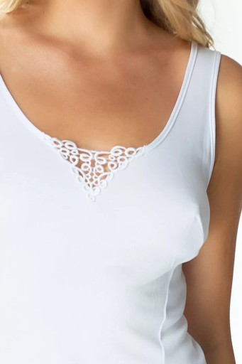 Dzięki pięknej aplikacji na dekolcie halka zyskuje czarujący wygląd i może służyć jako bluzka bazowa pod sweterek czy do marynarki i eleganckiej spódniczki.