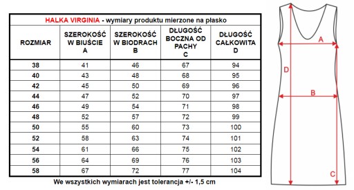 Virginia to prosty, dopasowany krój, z dekoltem w szpic, który wykończony jest delikatną, ozdobną gipiurą. Halka na wygodnych szerokich ramiączkach z długością przed kolano gwarantuje pewność ruchów w każdej sytuacji.