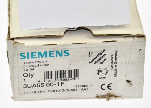 Nie używany, pochodzący z likwidowanych zapasów magazynu utrzymania ruchu element o symbolu: 3UA55 00-1F, produkt firmy Siemens. Wyłącznik termiczny silników o zakresie nastawy od 3,2 do 5A. Pochodzi z likwidowanych zapasów magazynu utrzymania ruchu. Posiada oryginalne opakowanie.