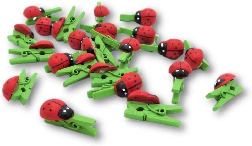 Do każdej klamerki przymocowany jest drewniana biedroneczka.