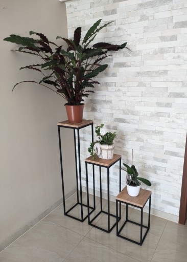 Profile metalowe są pomalowane farbą proszkową o matowym wykończeniu. Kwietnik posiada blat z płyty meblowej o grubości 16mm w kolorze Dąb Craft złoty.