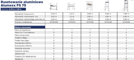 Rusztowanie składane ALX FS 75. Wysokiej jakości i do użytku przez profesjonalistów i majsterkowiczów. ALX FS 75 jest również prosta i solidna w konstrukcji, ale także lekka, mocna i elastyczna w użytkowaniu / konserwacji. Ponadto ALX FS 75 można również rozszerzyć do wysokości roboczej 7,8 metra