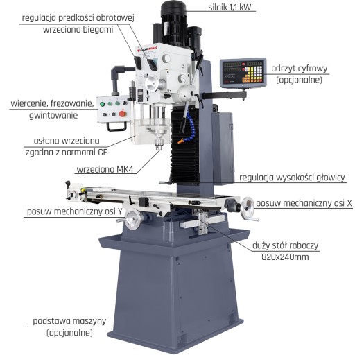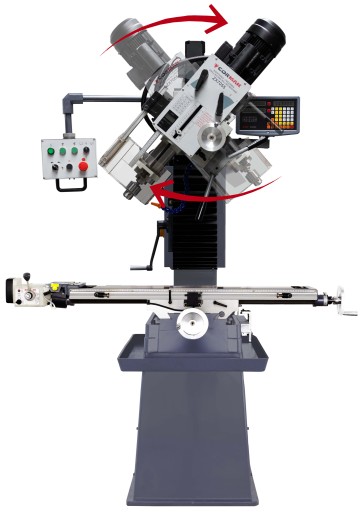 Średniej wielkości frezarko-wiertarka z głowicą pionową z autoposuwem, poruszaną automatycznie za pomocą silnika. Frezarka dodatkowo posiada funkcje gwintowania oraz odczyt cyfrowy w standardzie Maszyna doskonale się sprawdza w małych i średnich wydziałach remontowych i produkcyjnych.
