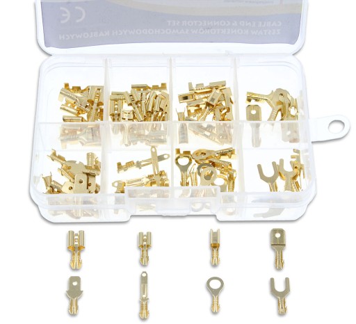 Zestaw konektorów, składający się z konektorów męskich, żeńskich, widełkowych i oczkowych, ok. 80-elementów. Konektory są nieizolowane i montowane na kabel. Konektory tego typu są często wykorzystywane w przemyśle i motoryzacji. Zestaw dostarczony jest w solidnym opakowaniu z elastycznego plastiku, Taki organizer umożliwia kontrolę wzrokową, zapobiega mieszaniu się różnych konektorów.