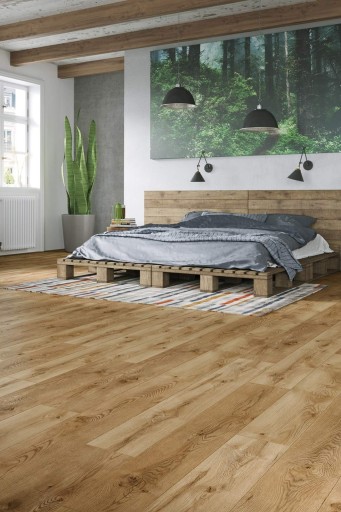 Dąb Athabasca Vision 4v 52796 1l 4v to panele naturalne w jasnym kolorze oraz klasycznym wzorze dębu eksponujące charakterystyczne usłojenie, żłobienie oraz szmery. Panel AC5 wykazuje wysoką klasę ścieralności, dzięki czemu sprawdzi się w pomieszczeniach o dużym natężeniu ruchu – także w hotelach, biurach oraz miejscach użyteczności publicznej. Wodoodporna, trudnopalna i antypoślizgowa powierzchnia o właściwościach antystatycznych zapewnia wygodne i bezpieczne użytkowanie. Panele objęte są 25-letnią gwarancją.