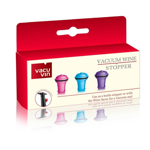 Próżniowe korki Vacum Wine Stoppers do wina Vacu Vin są przeznaczone do stosowania w połączeniu z pompkami próżniowymi producenta. Zestaw zawiera 3 korki, każdy w innym kolorze