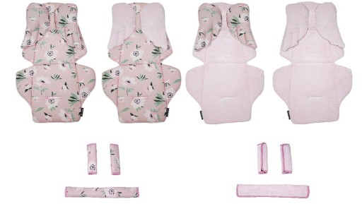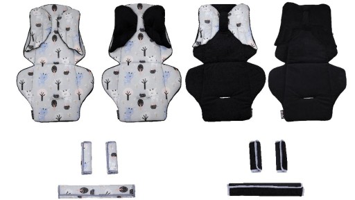 Dwustronna wkładka do wózka dziecięcego z poduszeczką "SKRZYDEŁKA" wraz z ochraniaczami na pasy i barierkę wykonane są z BAWEŁNY w różnych wzorach i kolorach połączonych z miłym w dotyku VELVETEM. W wewnątrz wkładka wypełniona jest sprężystą, oddychającą pianką o grubości 10 mm i puszystą, antyalergiczną włókniną silikonową.