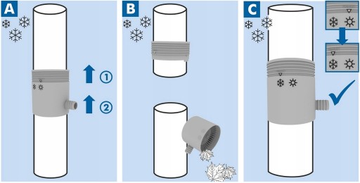 Zbieracze uniwersalne, pasują do rur o średnicach w zakresie 53 - 75 mm oraz rur z dowolnego materiału, tj. zarówno plastikowych jak i metalowych. Zbieracze można montować na już istniejącej instalacji bez konieczności zdejmowania rury. Zbieracz posiada wbudowany filtr. Zbieracz posiada nastawę lato / zima przez obrócenie kopułki. Nastawa zima powoduje odcięcie dopływu wody do zbiornika.