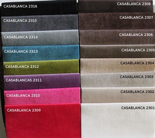 Casablanca to tkanina zmywalna. Struktura materiału pozwala na usunięcie większości zabrudzeń poprzez: odsączanie, aplikację wody lub wody z mydłem, bądź przecieranie ściereczką. Specjalna powłoka zapobiega wsiąkaniu płynów oraz ułatwia zbieranie płynnych zabrudzeń. Tkanina obiciowa Casablanca jest miła w dotyku i delikatnie mieniąca się w świetle. Tkanina wykonana w technologi Cleanboo co ogranicza wchłanianie płynów, np. wody, kawy, soków. Rozlany płyn natychmiast formuje się w krople i nie wnika do wnętrza tkaniny.