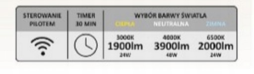 - barwa światła produktu: ustawiana pilotem od 3000K do 6500K ciepła - neutralna - zimna biała