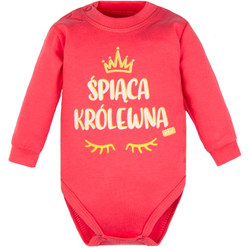 Bawełniane body w kolorze koralowym z wesołym napisem ŚPIĄCA KRÓLEWNA.
