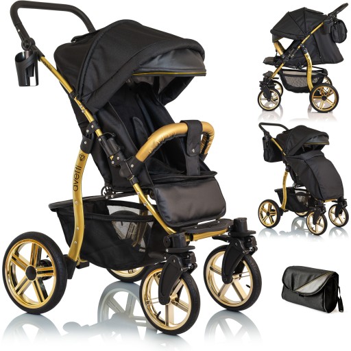 Przedstawiamy Ci rewelacyjny WÓZEK SPACEROWY z dużymi kołami żelowymi, dużym daszkiem, złotym stelażem, złotą i czarną ekoskórą, regulowaną rączką, funkcją spania i bardzo dobrą amortyzacją.