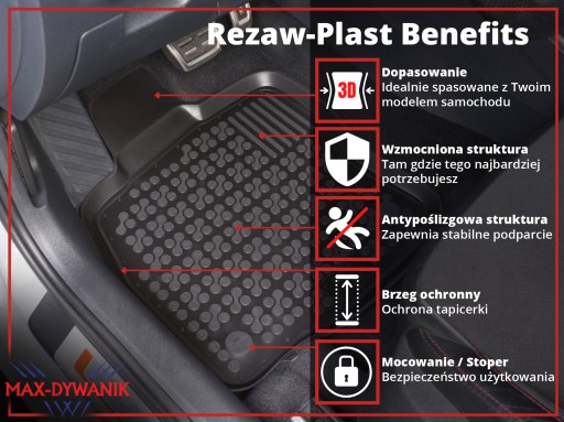 Dywaniki gumowe renomowanej polskiej firmy REZAW-PLAST zmodyfikowane o dedykowane mocowania wyprodukowane i zamontowane przez firmę MAX-DYWANIK® według oryginalnego rozstawu mocowań w samochodzie.